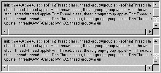 PrintThreadapplets.PrintThreadis a modified version of SimpleApplet that prints the thread and thread group that itsinit,start,stop,destroy, andupdatemethods are called from. (Actually, due to a Netscape Navigator 2.0 for Windows 95/NT bug, the following applets don't implementupdate. If you aren't using a PC that's running Netscape Navigator 2.0, you should be able to run the real example.) Here's the code for the hobbled example, and for the more interesting example. As usual, to see the output for the methods such asdestroythat are called during unloading, you need to look at the standard output. See Displaying Diagnostics to the Standard Output and Error Streams for information about the standard output stream.