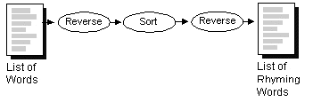 reverseandsortmethods from themainmethod in theRhymingWordsclass:The innermost call toFileReader words = new FileReader("words.txt"); Reader rhymingWords = reverse(sort(reverse(words)));reversetakes aFileReaderopened on the filewords.txtthat contains a list of words. The return value ofreverseis passed tosort, whose return value is then passed to another call toreverse.Let's look at the