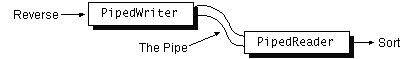 reversemethod; thesortmethod is similar and you will understand it once you understandreverse.The bold statements inpublic static Reader reverse(Reader source) { BufferedReader in = new BufferedReader(source); PipedWriter pipeOut = new PipedWriter(); PipedReader pipeIn = new PipedReader(pipeOut); PrintWriter out = new PrintWriter(pipeOut); new ReverseThread(out, in).start(); return pipeIn; }reversecreate both ends of a pipe--aPipedWriterand aPipedReader-- and connects them by constructing thePipedReader"on" thePipedWriter. Whatever's written to thePipedWritercan be read from thePipedReader. The connection forms a pipe, as illustrated here:reversestarts aReverseThreadthat writes its output to thePipedWriterand then returns thePipedReaderto the caller. The caller then arranges for a sorting thread to read from it. Thesortmethod is exactly the same, except that it creates and starts aSortThread.Using Streams to Wrap Other Streams