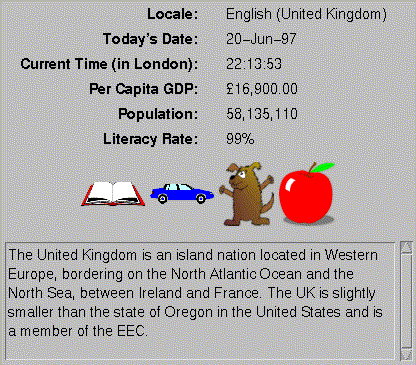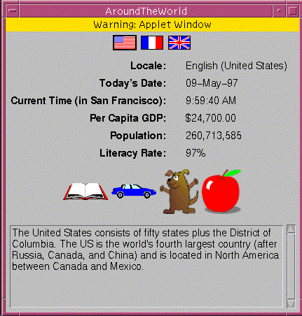 When you first invokeAroundTheWorldyou see a window that looks like this:You use the flag symbols at the top of the window to choose a new locale. The currently selected locale is indicated by a thick border around the flag. When you select a new locale, the window changes to display useful tidbits of information about that locale: the name of the locale, today's date, the current time in a city representative of the locale, the per capita GDP, the population, the literacy rate, and a brief paragraph describing the region. (These tidbits were retrieved from the CIA's 1994 World Fact book on the Internet).In addition to the facts displayed about each locale,