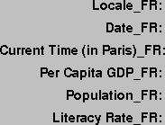 contentsarray created by LabelsBundle is built statically and contains only Strings. The values are the strings AroundTheWorld uses to display the text labels in its LinguaPanels:The AroundTheWorld program defines one other version of LabelsBundle, the French language version, of LabelsBundle--LabelsBundle_fr:LabelsBundle_fr is the same as LabelsBundle, except that the values have been translated into French. Note that the keys have not changed. The keys are used to look up values in the bundle. So, you must use the same keys for the same items in related ResourceBundles.import java.util.ListResourceBundle; public class LabelsBundle_fr extends ListResourceBundle { public Object[][] getContents() { return contents; } static final Object[][] contents = { // LOCALIZE THIS { "LocaleLabel", "Locale_FR: " }, { "DateLabel", "Date_FR: " }, { "TimeLabel", "Current Time (in {0})_FR:" }, { "RepCity", "Paris" }, { "TimeZone", "ECT" }, { "GDPLabel", "Per Capita GDP_FR: " }, { "PopulationLabel", "Population_FR: " }, { "LiteracyLabel", "Literacy Rate_FR: " }, // END "LOCALIZE THIS" }; }To retrieve a specific string value from a ResourceBundle usegetString. Here's the code that LinguaPanel uses to extract the labels for the textfields from LabelsBundle:When the Locale.US LinguaPanel invokes these statements,localeLabel.setText(labels.getString("LocaleLabel")); . . . dateLabel.setText(labels.getString("DateLabel")); . . . gdpLabel.setText(labels.getString("GDPLabel")); . . . populationLabel.setText(labels.getString("PopulationLabel")); . . . literacyLabel.setText(labels.getString("LiteracyLabel"));labelsis a LabelsBundle object. When the Locale.UK LinguaPanel invokes these statements,labelsis a LabelsBundle_en_GB object. And when the Locale.FRANCE LinguaPanel invokes these statements,labelsis a LabelsBundle_fr object. Thus the GUI elements reflect the current locale.Property Resource Bundles