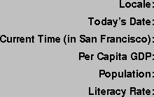 Let's begin with the LabelsBundle class:import java.util.ListResourceBundle; public class LabelsBundle extends ListResourceBundle { public Object[][] getContents() { return contents; } static final Object[][] contents = { // LOCALIZE THIS { "LocaleLabel", "Locale: " }, { "DateLabel", "Today's Date: " }, { "TimeLabel", "Current Time (in {0}): " }, { "RepCity", "San Francisco" }, { "TimeZone", "PST" }, { "GDPLabel", "Per Capita GDP: " }, { "PopulationLabel", "Population: " }, { "LiteracyLabel", "Literacy Rate: " }, // END "LOCALIZE THIS" }; }LabelsBundle is a subclass of ListResourceBundle. As such, it must override the