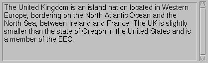 ParagraphBundle_fr.properties.And here'sLocaleDescription=France is the largest Western European country and is a member of the EEC. France shares borders with Andorra, Belgium, Germany, Italy, Luxembourg, Manaco, Spain and Switzerland.ParagraphBundle_en_GB.properties.To retrieve text from a PropertyResourceBundle you useLocaleDescription=The United Kingdom is an island nation located in Western Europe, bordering on the North Atlantic Ocean and the North Sea, between Ireland and France. The UK is slightly smaller than the state of Oregon in the United States and is a member of the EEC.getStringwith the key for the property that you want to get:When the Locale.US LinguaPanel invokes these statements,description = new TextArea(paragraph.getString("LocaleDescription"), 7, 10, TextArea.SCROLLBARS_VERTICAL_ONLY);paragraphsis a PropertyResourceBundle object whose values were loaded fromParagraphBundle.properties. And so on for the other two LinguaPanels.