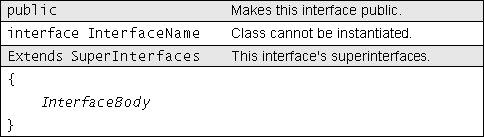 An interface declaration can have one other component: the public access specifier and a list of superinterfaces. The full interface declaration looks like this figure: