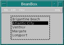 The OurListBox demo Bean illustrates how to use an indexed property. OurListBox extends the List class to provide a Bean that presents the user a list of choices: Choices that you can provide and change at design time. Here's an illustration of an OurListBox instance: