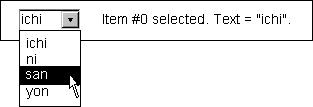 action()method (which is the same ase.arg), is the string from the selected item.Besides the methods used above, the Choice class defines these other useful methods://...Where instance variables are defined: Choice choice; //pop-up list of choices //...Where initialization occurs: choice = new Choice(); choice.addItem("ichi"); choice.addItem("ni"); choice.addItem("san"); choice.addItem("yon"); label = new Label(); setLabelText(choice.getSelectedIndex(), choice.getSelectedItem()); . . . public boolean action(Event e, Object arg) { if (e.target instanceof Choice) { setLabelText(choice.getSelectedIndex(), (String)arg); return true; } return false; } }
