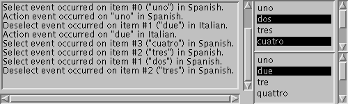 Below is an applet that shows two lists, along with a text area that displays information about events. The top list (which lists Spanish numbers) allows multiple selections. The bottom (which lists Italian numbers) allows a maximum of one selection. Note that the first item in each list has index 0.