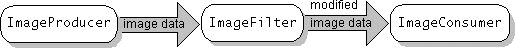 The AWT supports image manipulation by letting you insert image filters between image producers and image consumers. An image filter is an ImageFilter(in the Creating a User Interface trail)object that sits between a producer and a consumer, modifying the image data before the consumer gets it. ImageFilter implements the ImageConsumer interface, since image filters intercept messages that the producer sends to the consumer. The following figure shows how an image filter sits between the image producer and consumer.