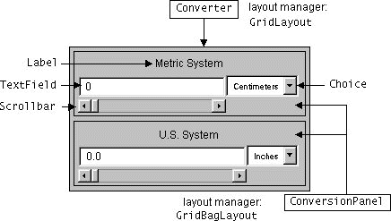 The example program uses several LayoutManagers, Containers, and Components provided by the AWT package. It also creates two Insets objects and two GridBagConstraints objects.The example program creates three objects that conform to the LayoutManager interface: a GridLayout and two GridBagLayouts. The GridLayout manages the layout of the Components in the Converter instance. Each ConversionPanel uses a GridBagLayout object to manage its Components, and a GridBagConstraints object to specify how to lay out each Component.