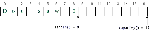 In addition to length, the StringBuffer class has a method called capacity, which returns the amount of space allocated for the string buffer rather than the amount of space used. For example, the capacity of the string buffer referred to by dest in the StringsDemo program never changes, although its length increases by 1 for each iteration of the loop. The following figure shows the capacity and the length of dest after nine characters have been appended to it.