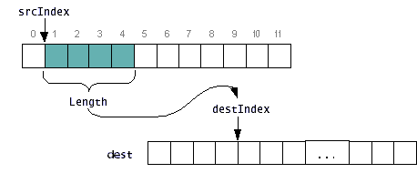 UseSystem'sarraycopymethod to efficiently copy data from one array into another. Thearraycopymethod requires five arguments:The twopublic static void arraycopy(Object source, int srcIndex, Object dest, int destIndex, int length,Objectarguments indicate the array to copy from and the array to copy to. The three integer arguments indicate the starting location in each the source and the destination array, and the number of elements to copy. This diagram illustrates how the copy takes place:The following program, ArrayCopyDemo, uses
