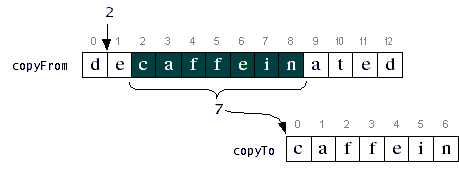 arraycopyto copy some elements from thecopyFromarray to thecopyToarray.Thepublic class ArrayCopyDemo { public static void main(String[] args) { char[] copyFrom = { 'd', 'e', 'c', 'a', 'f', 'f', 'e', 'i', 'n', 'a', 't', 'e', 'd' }; char[] copyTo = new char[7]; System.arraycopy(copyFrom, 2, copyTo, 0, 7); System.out.println(new String(copyTo)); } }arraycopymethod call in this example program begins the copy at element number 2 in the source array. Recall that array indices start at 0, so that the copy begins at the array element 'c'. Thearraycopymethod call puts the copied elements into the destination array beginning at the first element (element 0) in the destination arraycopyTo. The copy copies 7 elements: 'c', 'a', 'f', 'f', 'e', 'i', and 'n'. Effectively, thearraycopymethod takes the "caffein" out of "decaffeinated", like this:Note that the destination array must be allocated before you call arraycopyand must be large enough to contain the data being copied.