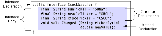 TheStockWatcherinterface and the structure of an interface definition.public interface StockWatcher { final String sunTicker = "SUNW"; final String oracleTicker = "ORCL"; final String ciscoTicker = "CSCO"; void valueChanged(String tickerSymbol, double newValue); }The interface shown in the figure above is the