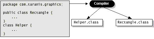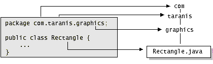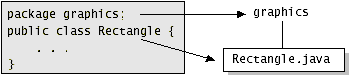 You put the source code for a class or an interface in a text file whose name is the simple name of the class or the interface and whose extension is .java. Then you put the source file in a directory whose name reflects the name of the package to which the class or the interface belongs. For example, the source code for the Rectangle class would be in a file named Rectangle.java, and the file would be in a directory named graphics. The graphics directory might be anywhere on the file system. The figure below shows how this works.