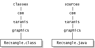 As you may recall, by convention a company uses its reversed Internet domain name in its package names. The fictional company whose Internet domain name is taranis.com would precede all its package names with com.taranis. Each component of the package name corresponds to a subdirectory. So if Taranis had a graphics package that contained a Rectangle.java source file, it would be contained in a series of subdirectories, as shown below.