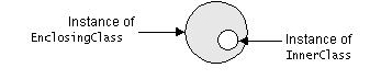 The interesting feature about the relationship between these two classes is not thatclass EnclosingClass { . . . class InnerClass { . . . } }InnerClassis syntactically defined withinEnclosingClass. Rather, it's that an instance ofInnerClasscan exist only within an instance ofEnclosingClassand that it has direct access to instance variables and methods of its enclosing instance. The following diagram illustrates this idea.You may encounter nested classes of both kinds in the Java API and be required to use them. However, most nested classes that you write will be inner classes.