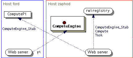 Finally, the Pi class is loaded into the ComputeEngine's virtual machine when the Pi object is passed in the executeTask remote call to the ComputeEngine object. The Pi class is loaded from the client's web server.