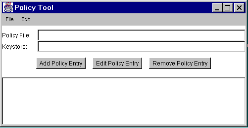 This brings up the Policy Tool window. Whenever Policy Tool is started, it tries to fill in this window with policy information from what is sometimes referred to as the "user policy file," which by default is a file named .java.policy in your home directory. If Policy Tool cannot find the user policy file, it reports the situation and displays a blank Policy Tool window (that is, a window with headings and buttons but no data in it, as shown in the following figure.