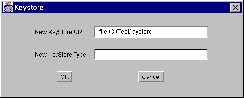 To specify the keystore named raystore in the Test directory on the C: drive, type the following file URL into the text box labeled New KeyStore URL