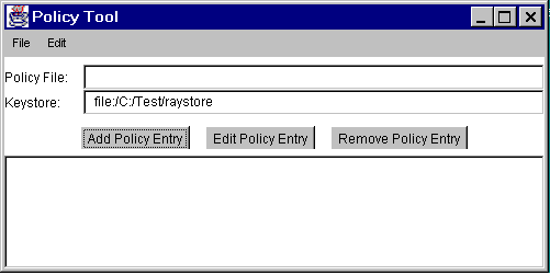 To specify the keystore, choose the Change Keystore command in the Edit menu of the main Policy Tool window. This brings up a dialog box in which you can specify the keystore URL and the keystore type.