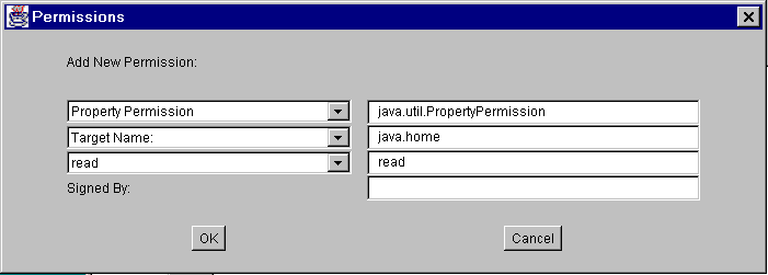 "user.home"property value, choose the Add Permission button. This brings up the Permissions dialog box.Do the following.