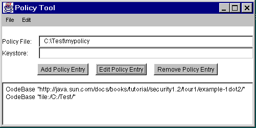 Click the image to view it at its natural size.You are now done specifying this policy entry, so choose the Done button in the Policy Entry dialog. The Policy Tool window now includes a line representing the new policy entry, showing the CodeBase value.